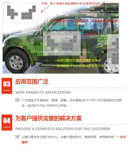 多年經(jīng)驗(yàn)偽裝波段范圍:可見光(380nm~760nm)和近紅外(760nm~1200nm); 外墻迷彩漆不是水漆。盡管水漆是一種環(huán)保型的涂料,;